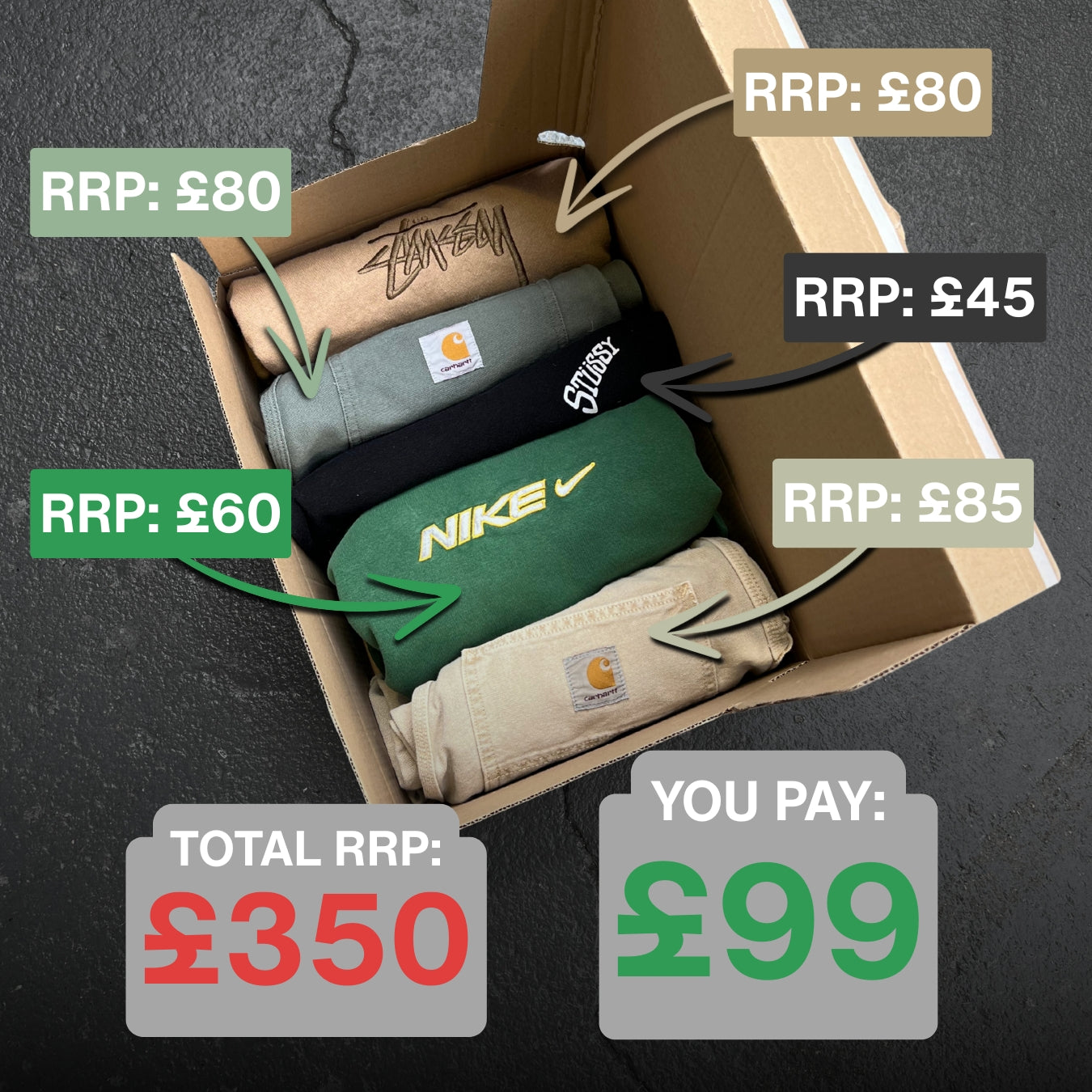 Each box contains a curated assortment of various vintage pieces from the 80’s, 90’s and 00’s. Sportswear, workwear, designer and loads more. Just pick your sizes and we’ll do the rest.
