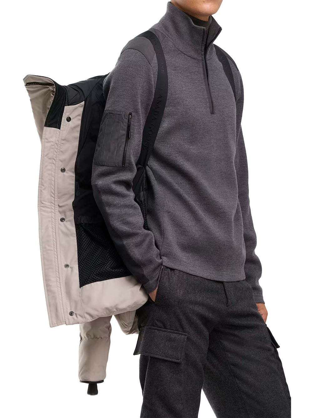 - Sleek interior hanging lining with backpack straps allow jacket to be carried hands-free over the shoulders