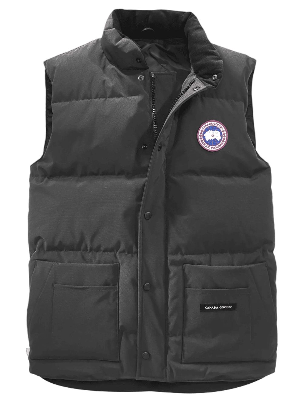 The Canada Goose Freestyle Crew Vest in Graphite is a lightweight and versatile built for year-round layering. This style has a suede tricot-lined stand collar, snap storm flap and concealed zip, making the ideal for UK transitional weather. Quilted down fill, fleece-lined hand pockets and a signature logo patch make this packable and practical.