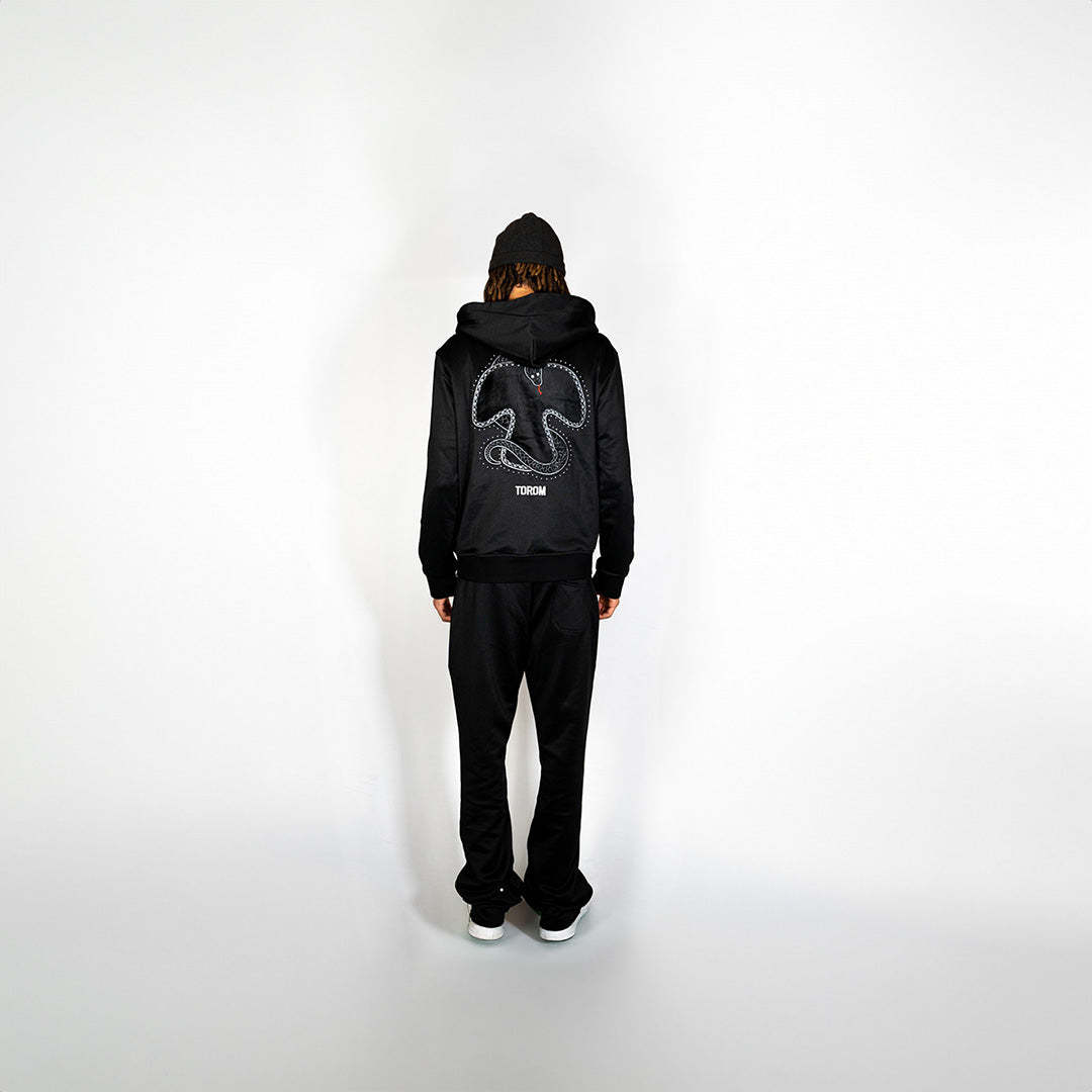 Élégance et audace se rencontrent dans la Veste Serpent Noir de Torom. Un modèle en noir profond, orné d’un motif serpent éclatant de paillettes dans le dos. Un design unique, pour ceux qui cherchent l'exclusivité et le raffinement absolu.